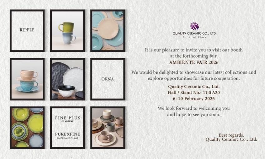 AMBIENTE FRANKFURT FAIR 2026 It is our pleasure to invite you to visit our booth at the forthcoming fair, AMBIENTE FAIR 2026 We would be delighted to showcase our latest collections and explore opportunities for future cooperation. Quality Ceramic Co., Ltd. Hall / Stand No.: 11.0 A20 6–10 February 2026 We…18